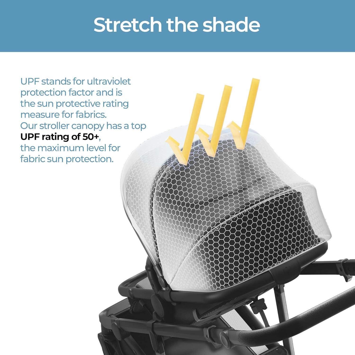 Shielded & Safe: Embrace sunny days with confidence using this stroller for newborns, featuring a zip-out UPF 50+ canopy for maximum coverage. Ventilation panels provide optimal airflow and natural light, while the included foot cover and rain cover protect against severe weather in this versatile bassinet stroller.